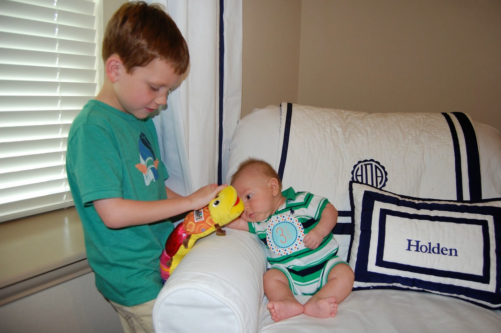 I can't believe this sweet baby is already 3 months old!! He has had an eventful past month that wasn't fun at times, but things are much better. At his two month appointment I was telling his doctor that I was worried about how fussy he was all the time and how he didn't seem very happy and wasn't smiling much. At the time she thought it was mainly due to his horrible reflux and changed his medicine again. She scheduled and Upper GI where it was confirmed that he has severe reflux and we also learned that he is aspirating a little bit when he swallows. Then, the following week while changing his diaper, I discovered blood in it. I panicked!! I immediately called the doctor while trying not to cry and after making an appointment my phone rang and it was our sweet pediatrician personally calling me. She told me that the blood meant he had a milk protein allergy and I was to immediately stop eating all dairy and soy. She then said it would take about 2 weeks to get out of his system, but that he should feel much better after that. She said that explained why he was so fussy and didn't seem happy. Poor baby had an upset tummy constantly. :( Well, I quickly learned that diary and soy is in EVERYTHING, but I cut it out immediately. He didn't seem to be getting any better and then I found blood again...TWICE. So, our pediatrician referred us to a pediatric gastroenterologist. She told me to cut out all beef and to also check my prenatal vitamins for soy. Sure enough...SOY in my vitamins. Seriously?? After cutting out beef and changing vitamins, we have a NEW, HAPPY BABY BOY! HOORAY!!! It was a long road, and this mama is eating pretty much a Paleo diet, but it is SO worth it to see his precious smile! Most babies grow out of this allergy around 8-10 months and it doesn't mean that he will be lactose intolerant. I'm already making a list of all the things I'll eat when I'm able to. Ha!